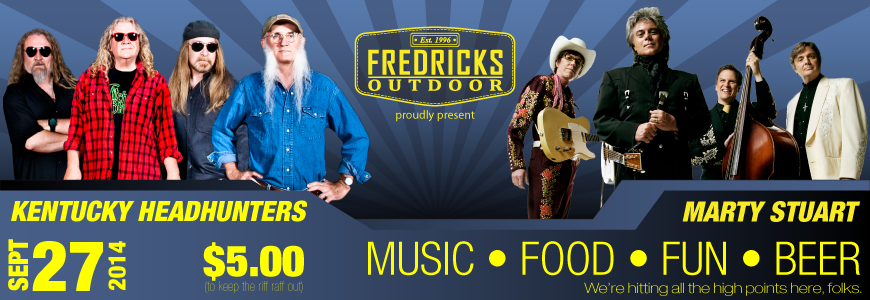 Fredricks Outdoor is excited to announce our 2014 Fall Concert featuring Grammy Award Winners Kentucky Headhunters and Marty Stuart, along with up-and-comer Logan Brill! As always, we will have a blast and we want you to come join in on the fun.